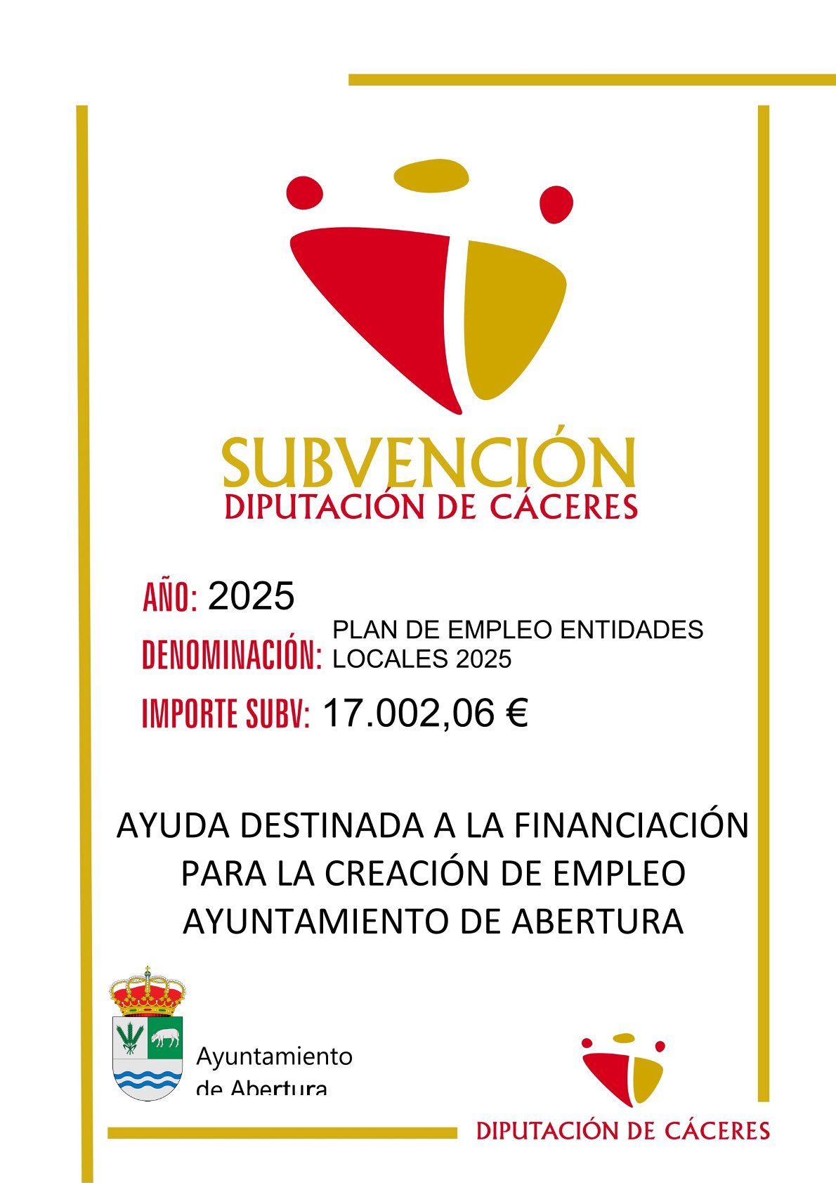 SUBVENCIONES - PLAN DE EMPLEO ENTIDADES LOCALES 2025 24 julio 2025 AYUDA DESTINADA A LA FINANCIACIÓN PARA LA CREACIÓN DE EMPLEO AYUNTAMIENTO DE ABERTURA