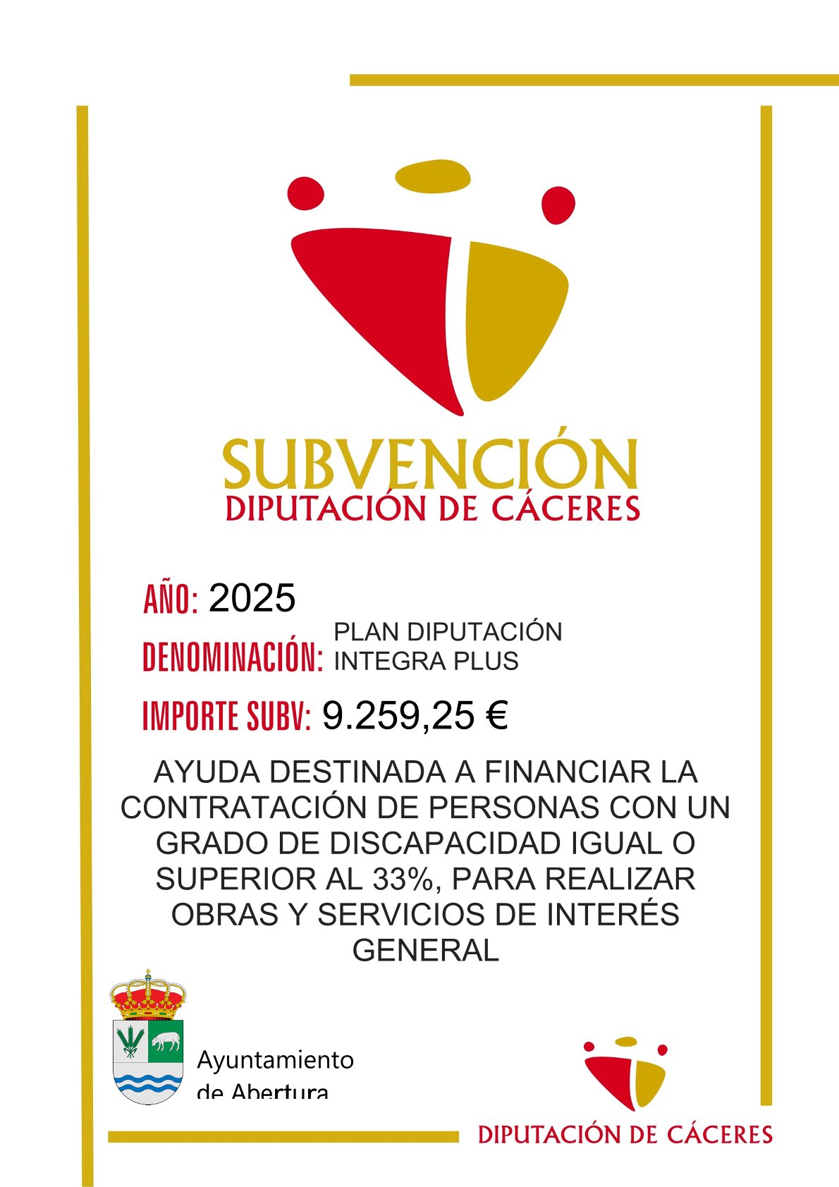 SUBVENCIONES - PLAN DIPUTACIÓN INTEGRA PLUS 24 julio 2025 AYUDA DESTINADA A FINANCIAR LA CONTRATACIÓN DE PERSONAS CON UN GRADO DE DISCAPACIDAD IGUAL O SUPERIOR AL 33%, PARA REALIZAR OBRAS Y SERVICIOS DE INTERÉS GENERAL