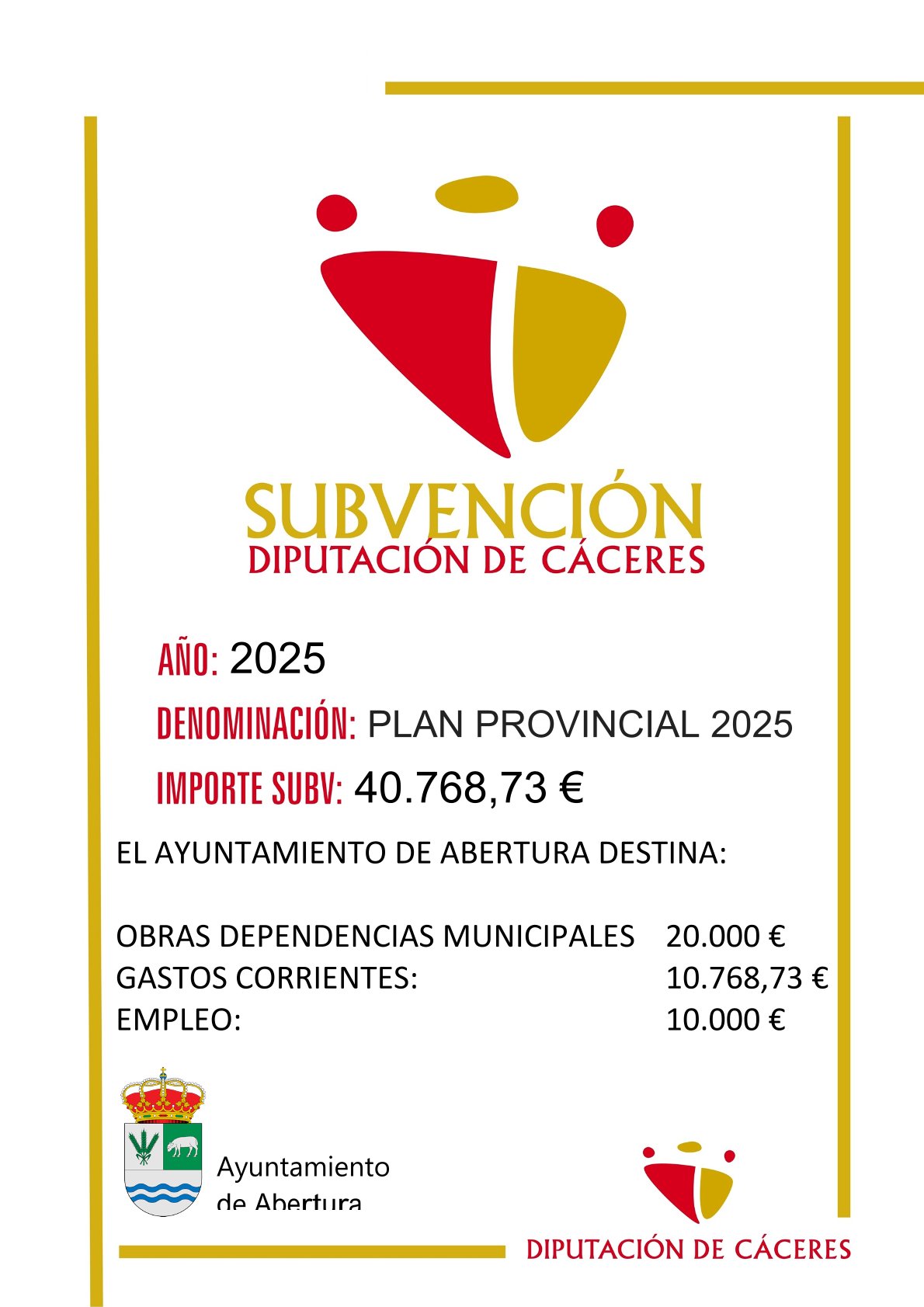 SUBVENCIONES - PLAN PROVINCIAL 2025 24 julio 2025 EL AYUNTAMIENTO DE ABERTURA DESTINA: OBRAS DEPENDENCIAS MUNICIPALES 20.000 € GASTOS CORRIENTES: 10.768,73 € EMPLEO: 10.000 €