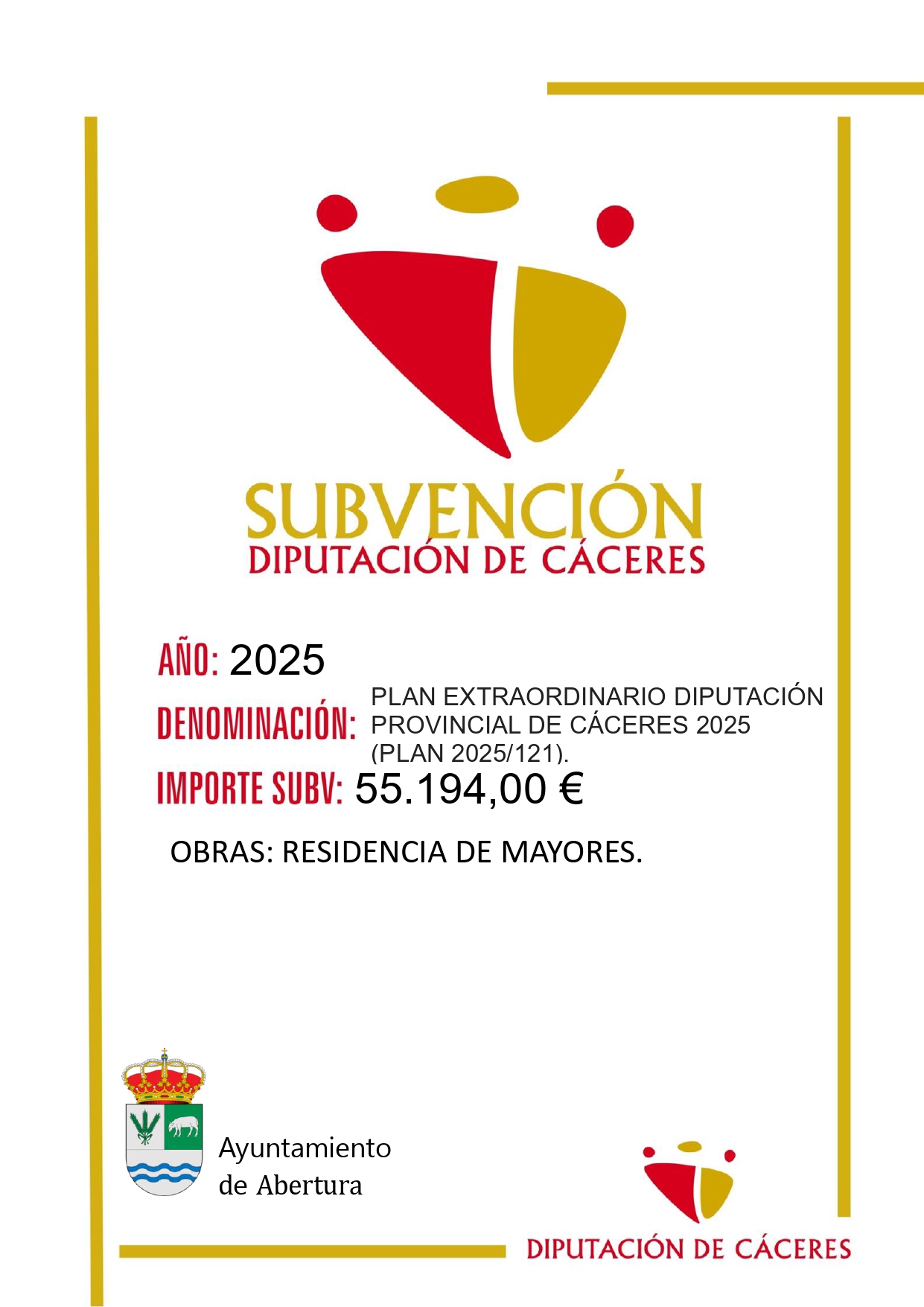 SUBVENCIONES - PLAN EXTRAORDINARIO DIPUTACIÓN PROVINCIAL DE CÁCERES 2025 (PLAN 2025/121). 25 agosto 2025 OBRAS: RESIDENCIA DE MAYORES.